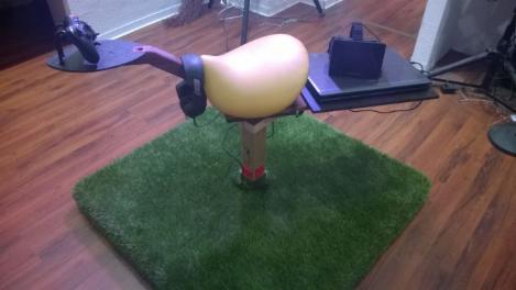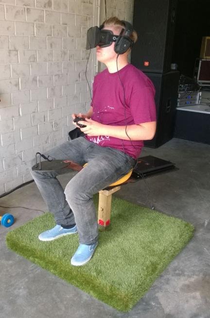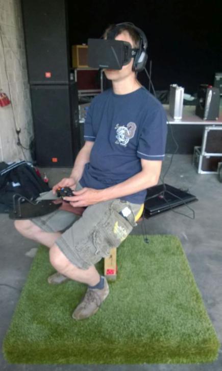 Einfach auf den Sattelsitz setzen, Rift und Kopfhörer aufsetzen, Gamepad in die Hand und losfliegen. Der Sitz läßt sich links/ rechts endlos um 360 Grad drehen – und mit ihm die Rift (auf dem Kopf des Piloten). Die Riftkabel werden an den Laptop angeschlossen, der sich hinter dem Sitz befindet und mitdreht. Das erforderliche Stromkabel des Laptops wird durch den Sitzfuß geführt und kann dank eines eingebauten elektronischen Bauteils nicht verdrehen.