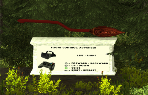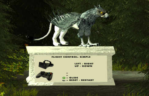 Controlling Buckbeaks flight is very simple – he flys, where you look at (with the Rift). Unfortunately the rift cables interfere 360 degrees turn arounds and twirl around the users body (everybody, who doesn't try the glasses just in sitting postion knows that).